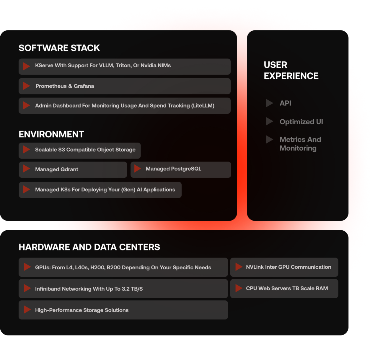 Leverage a battle-tested AI infrastructure with Kubernetes, Kubeflow, KServe, Triton, and vLLM. Whether deploying transformers for inference or managing complex ML pipelines, our platform ensures scalability, flexibility, and performance without vendor lock-in.